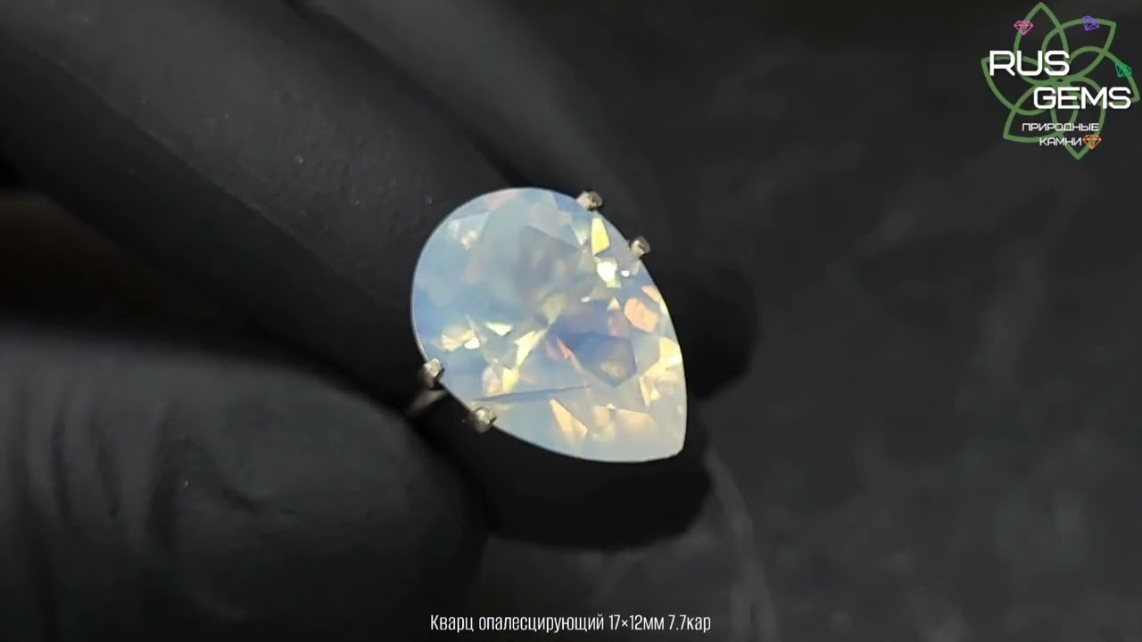 Кварц с эффектом опалесценции. Эффект вызван взвесью мелких частиц, рассеивающих свет и создающих опаловидное сияние внутри камня. Природный опалесцирующий кварц. Месторождение Бразилия. Груша 17х12 мм, 7.7кар.